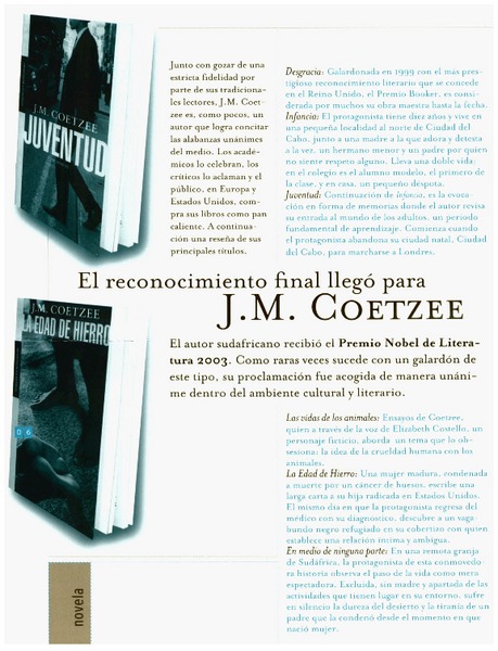 El Reconocimiento final llegó para J. M. Coetzee. [artículo]