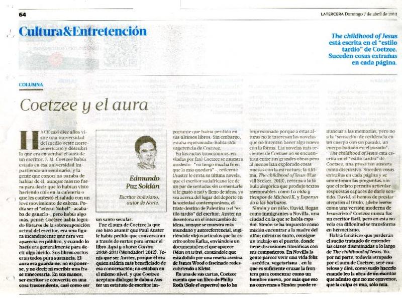 Coetzee y el aura [artículo] Edmundo Paz Soldan
