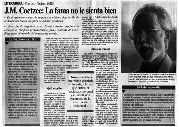 Escritor sudafricano ganó Premio Nobel de Literatura. [artículo]