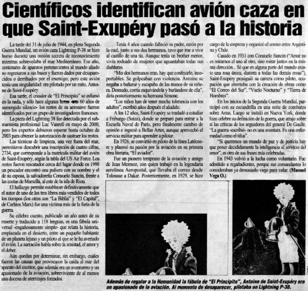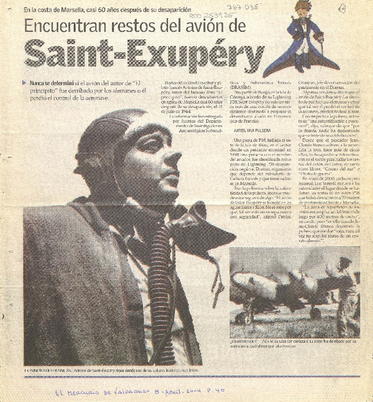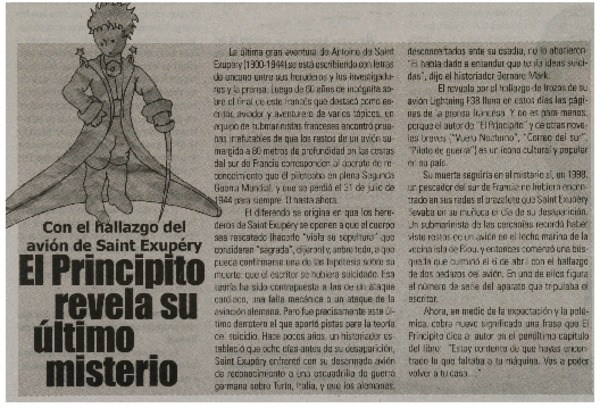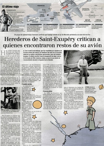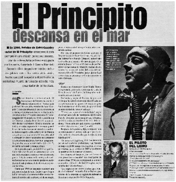 Hallan restos del avión de Saint-Exupéry El autor de "El Principito", piloto de guerra, fue derribado en 1944 por la artillería alemana [artículo] :