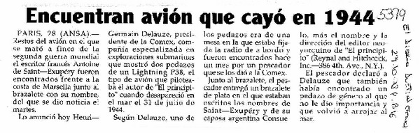 Encuentran restos del avión de Saint-Exupéry. [artículo]