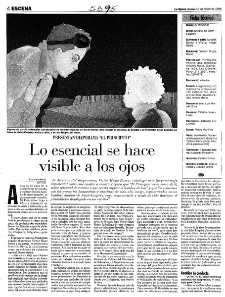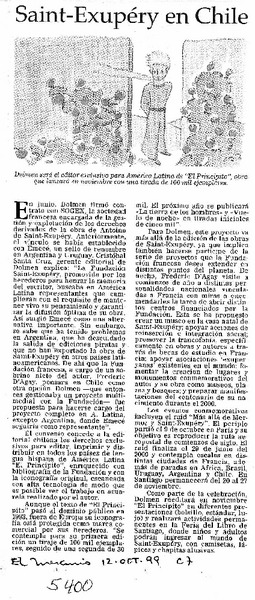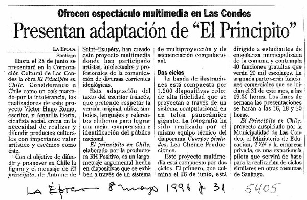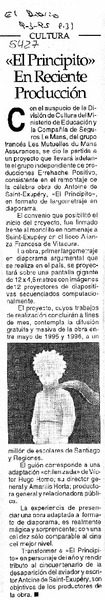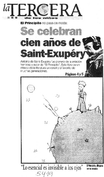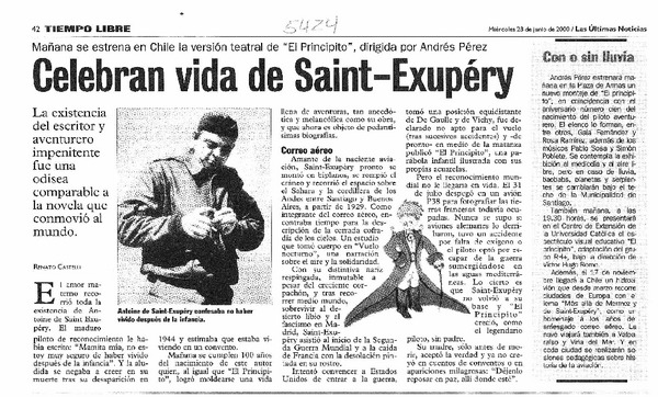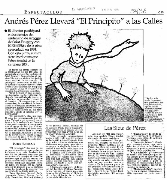 Celebran vida de Saint-Exupéry Manaña se estrena en Chile la vesión teatral de "El Principito", dirigida por Andrés Pérez [artículo] : Renato Castelli.