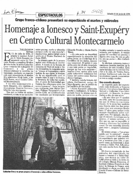 Homenaje a Ionesco y Saint-Exupéry en Centro Cultural Montecarmelo Grupo franco-chileno presentará su espectáculo el martes y miércoles [artículo] : Yael Zaliasnik.