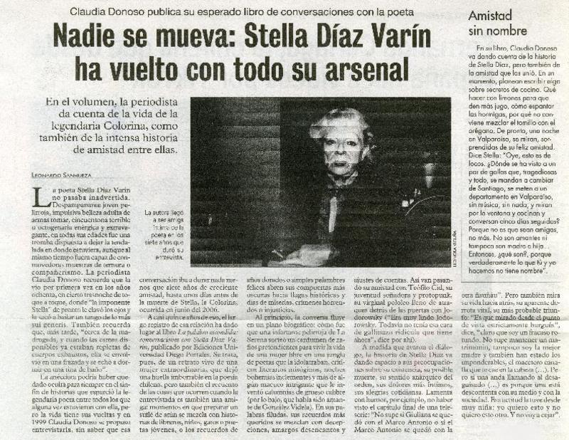 Nadie se mueva : Stella Díaz Varín ha vuelto con todo su arsenal [artículo] Leonardo Sanhueza.