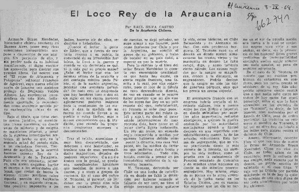 El loco rey de la Araucanía [artículo] Raúl Silva Castro.