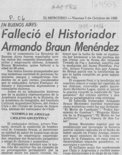 Falleció el historiador Armando Braun Menéndez [artículo].