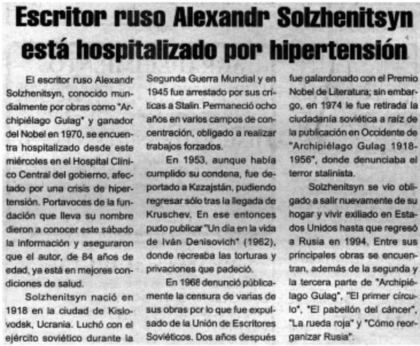 Escritor ruso Alexandr Solzhenitsyn está hospitalizado por hipertensión. [artículo]