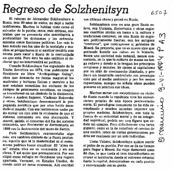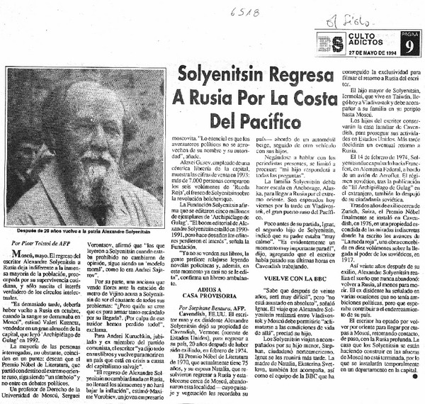 Solyenitsin regresa a Rusia por la Costa del Pacífico [artículo] Piotr Tolstoi.
