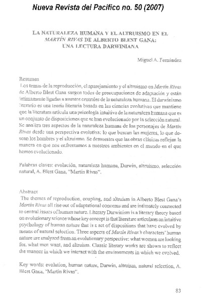 La naturaleza humana y el altruismo en el Martín Rivas de Alberto Blest Gana [artículo] Miguel A. Fernández.