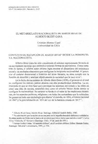 El metarrelato nacionalista en Martín Rivas de Alberto Blest Gana [artículo] Cristián Montes Capó.