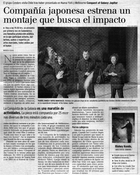 Compañía japonesa estrena un montaje que busca el impacto [artículo] Manuela Silva.