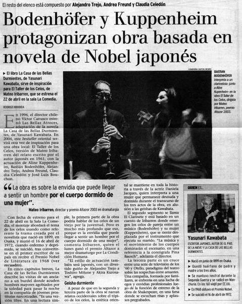 Bodenhöfer y Kuppenheim protagonizan obra basada en novela de Nobel japonés [artículo] Rodrigo Miranda.