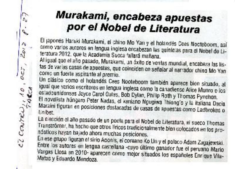 Murakami, encabeza apuestas por el Nobel de Literatura [artículo]