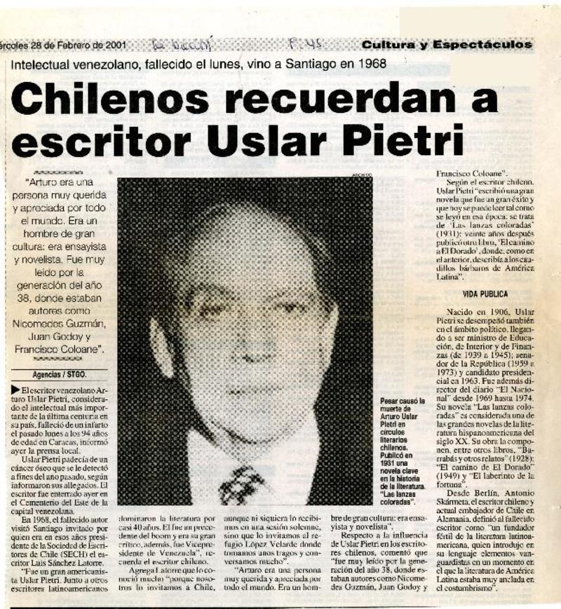 Chilenos recuerdan a escritor Uslar Pietri [artículo]