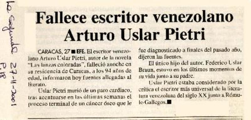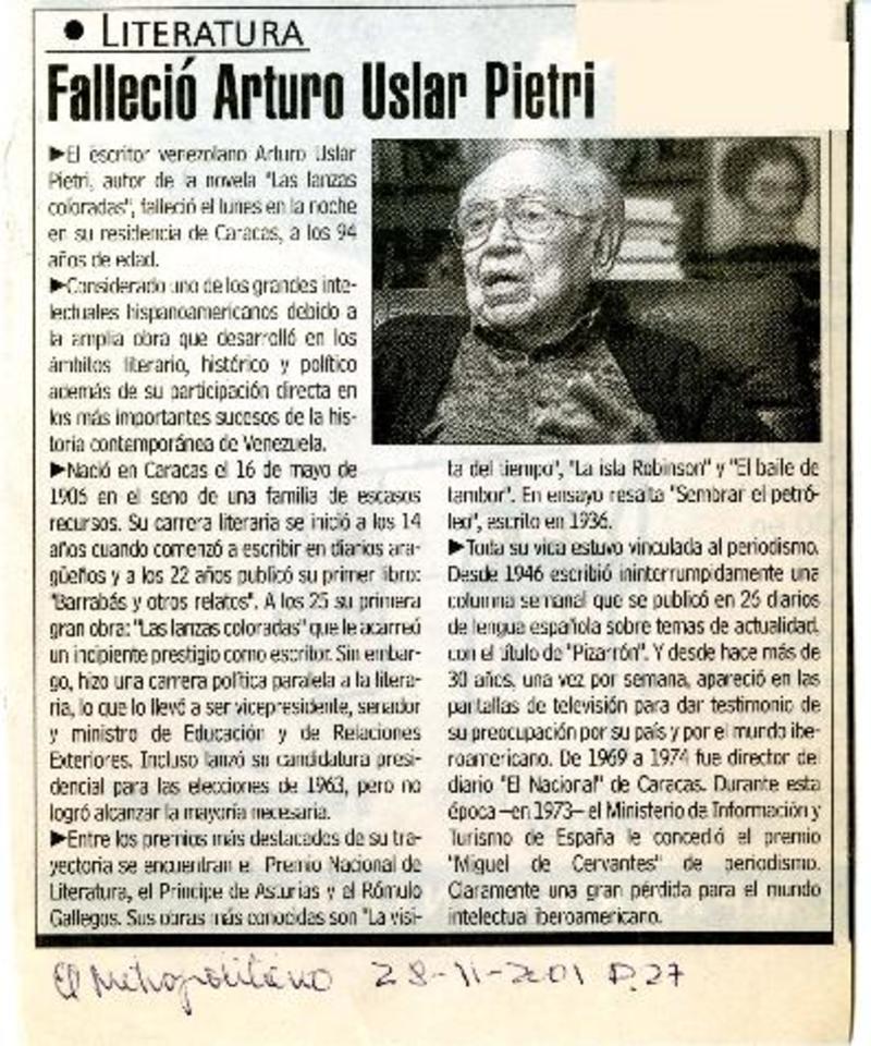 Fallece escritor venezolano Arturo Ulsar Pietri [artículo]