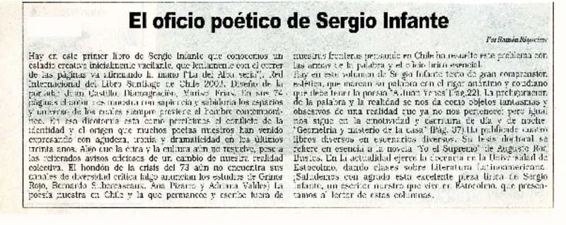 El oficio poético de Sergio Infante [artículo]Ramón Riquelme.
