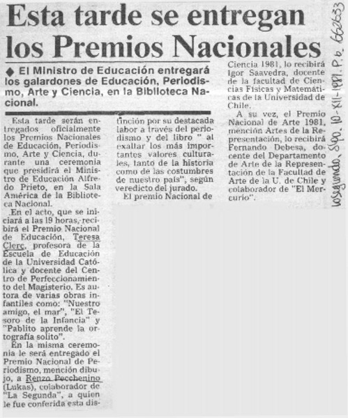 Esta tarde se entregan los premios nacionales. [artículo]
