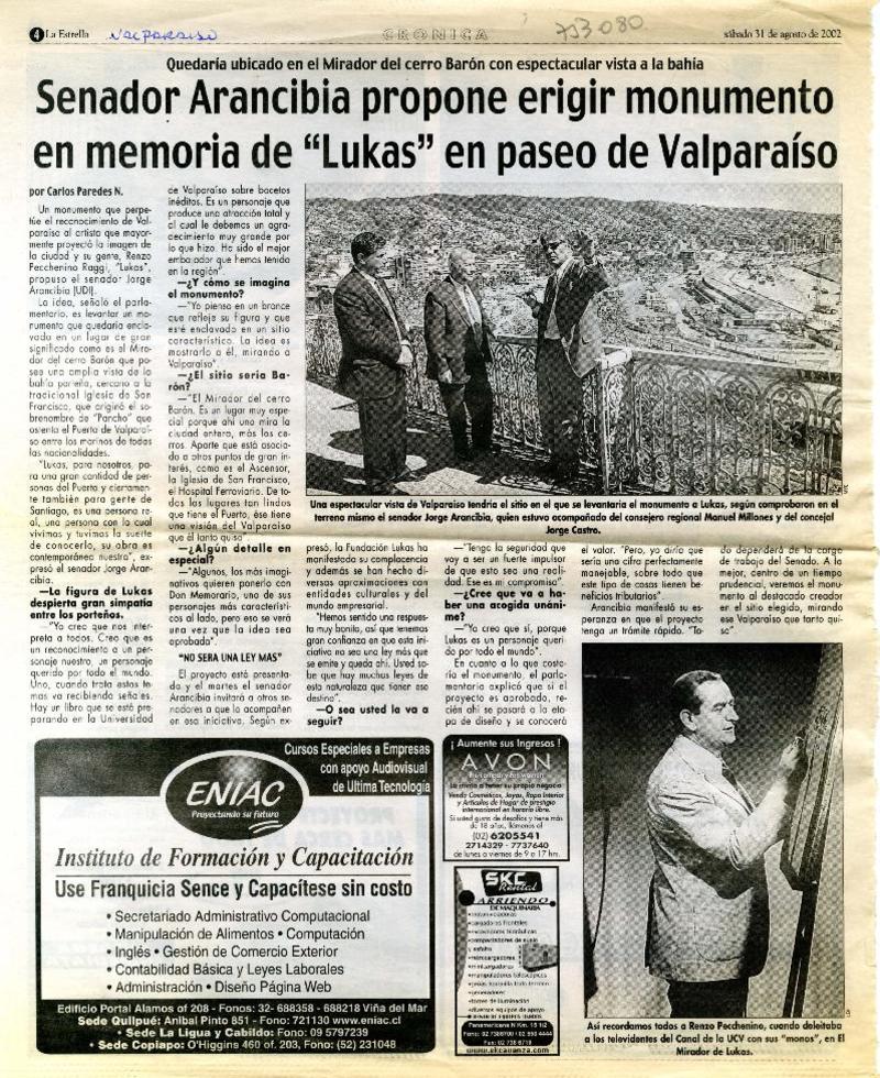Senador Arancibia propone erigir monumento en memoria de "Lukas" en paseo de Valparaíso [entrevista] [artículo] : Carlos Paredes N.