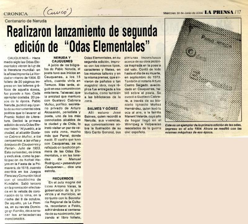 Realizaron lanzamiento de segunda edición de "Odas elementales" centenario de Neruda [artículo] :