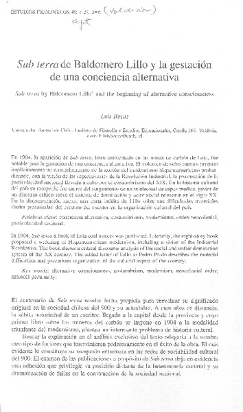 Sub Terra de Baldomero Lillo y la gestación de una conciencia alternativa [artículo] Luis Bocaz