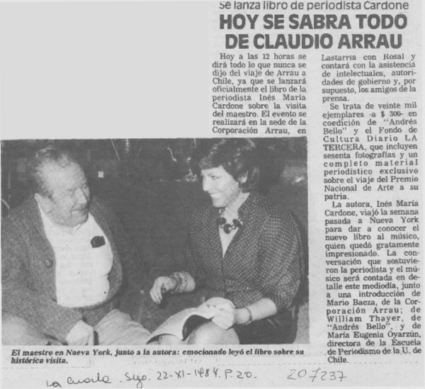 Hoy se sabrá todo de Claudio Arrau [artículo].