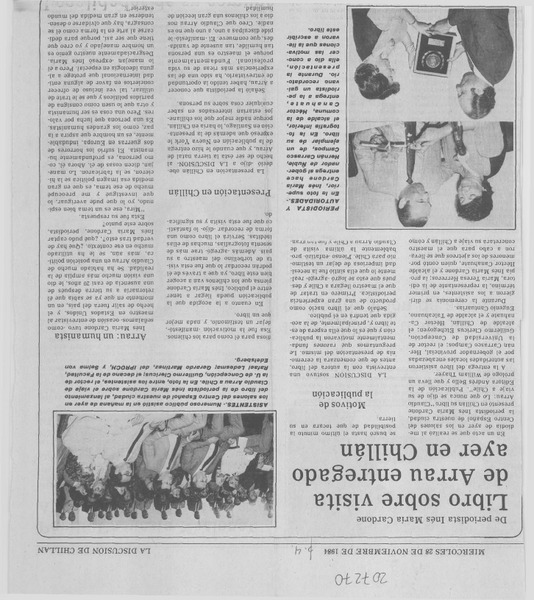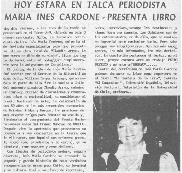 Hoy estara en Talca periodista María Inés Cardone - Presenta libro. [artículo]