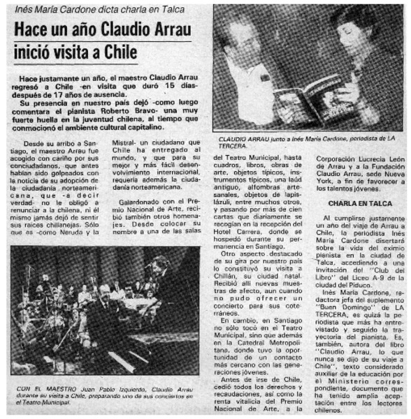 Hace un año Claudio Arrau inició visita a Chile. [artículo]