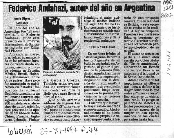 Federico Andahazi, autor del año en Argentina [artículo] Ignacio Iníguez.