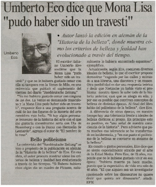 Umberto Eco dice que Mona Lisa "pudo haber sido un travesti" [artículo]