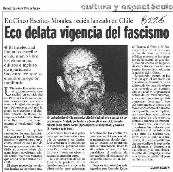 Eco delata vigencia del fascismo [artículo] Rodolfo Arenas R.
