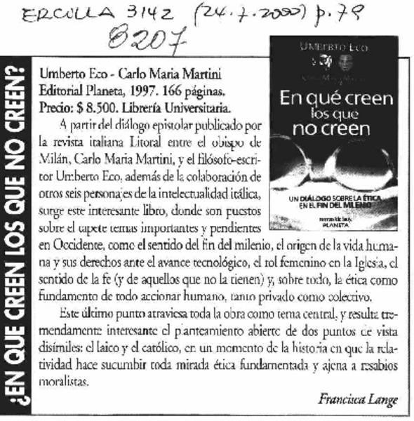 En qué creen los que no creen? [artículo] Francisca Lange.
