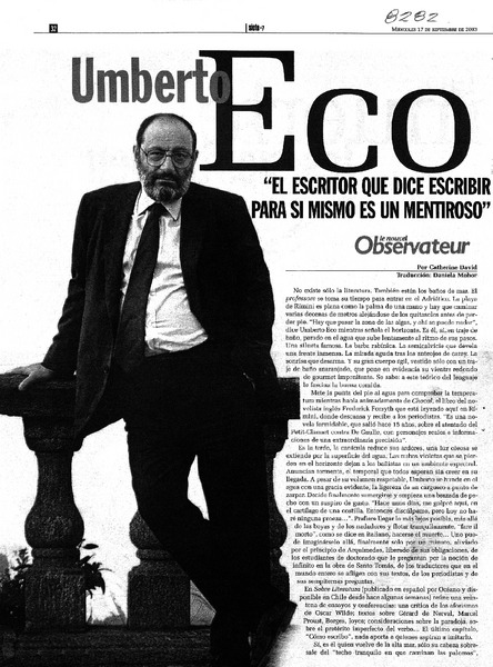 Umberto Eco, "el escritor que dice escribir para si mismo es un mentiroso" [artículo] Catherine David.