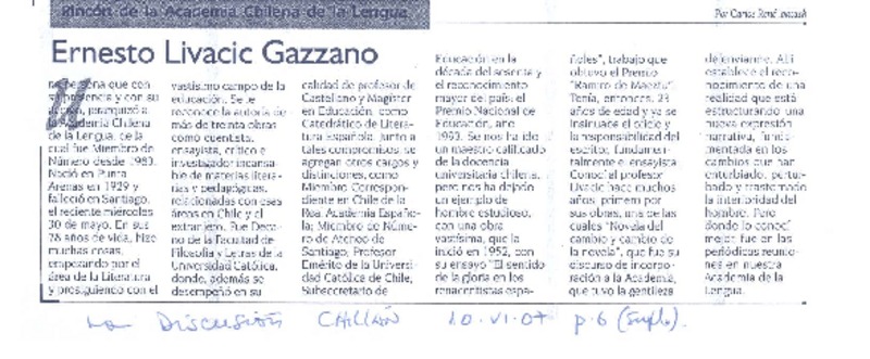 Ernesto Livacic Gazzano en la Academia de la Lengua [artículo] Héctor González V.