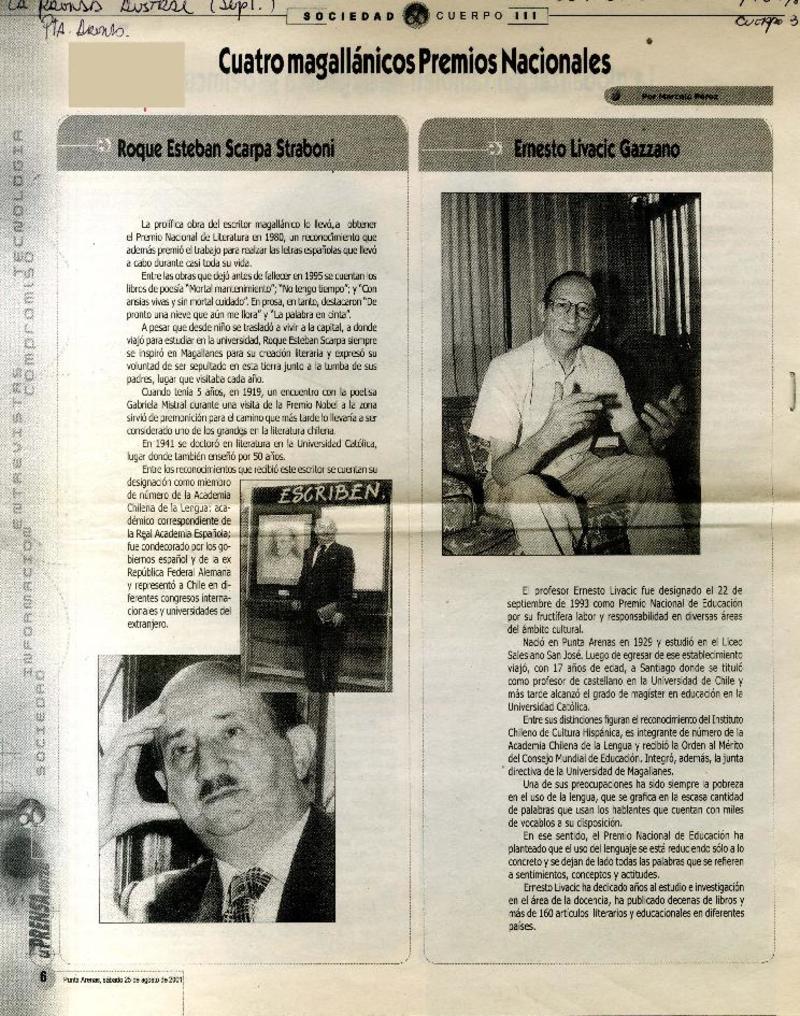 Cuatro magallánicos Premios Nacionales [artículo] Marcelo Pérez.