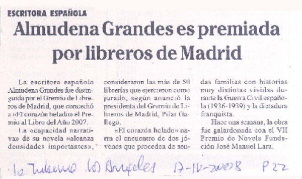 Almudena Grandes es premiada por libreros de Madrid [artículo].