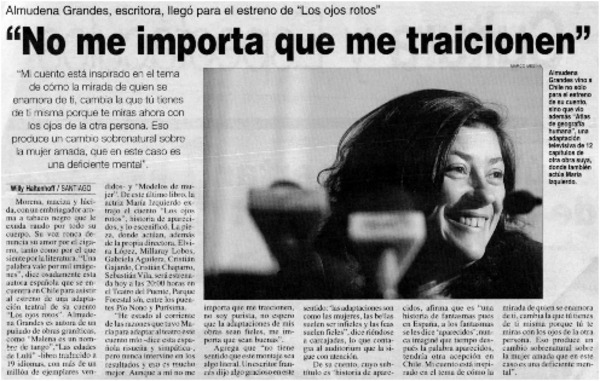"No me importa que me traicionen" Almudena Grandes, escritora, llegó para el estreno de "Los ojos rotos" [artículo] : Willy Haltenhoff.