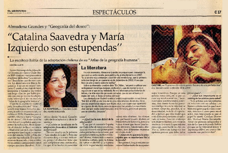 Autoras chilenas - Autoras españolas - Entrevista - Grandes, Almudena - Izquierdo, María - Modelos de mujer - Atlas de Geografía humana - Ojos rotos : historia de aparecidos