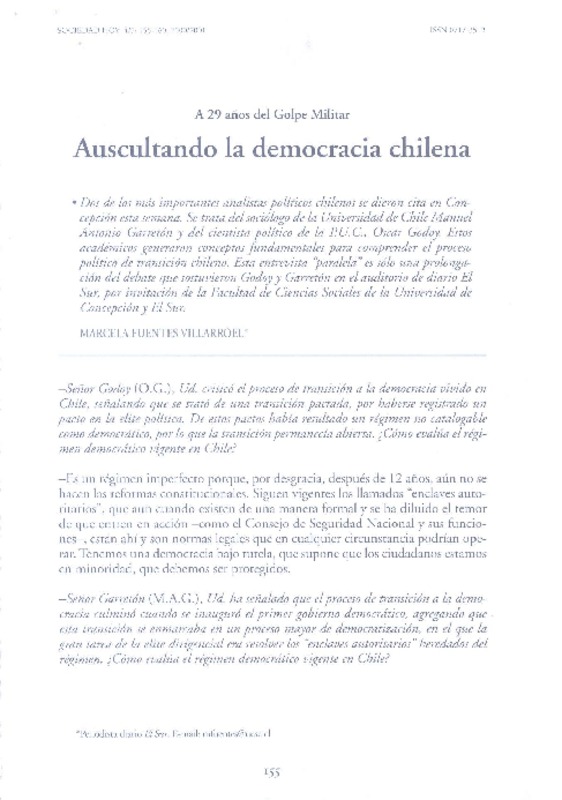 Auscultando la democracia chilena A 29 años del Golpe Militar [artículo] : Marcela Fuentes.