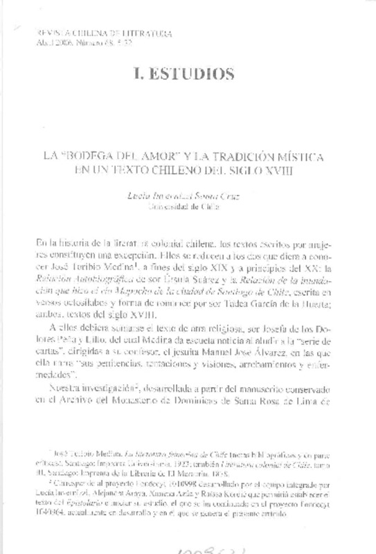 La "Bodega del amor" y la tradición mística en un texto chilenos del siglo 18 [artículo] Lucía Invernizzi Santa Cruz.