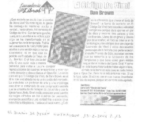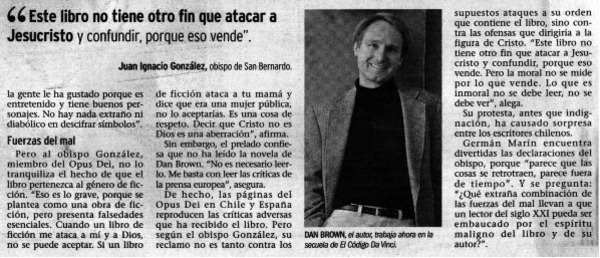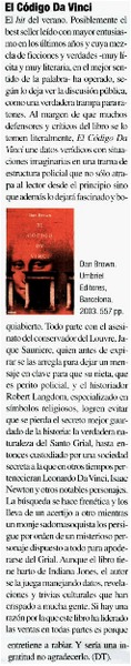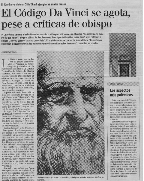 El Código Da Vinci se agota, pese a críticas de obispo [artículo] Andrés Gómez.
