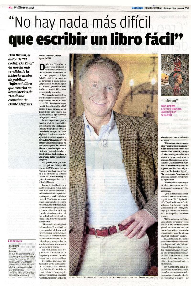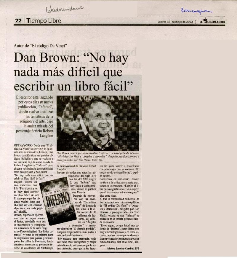 Dan Brown : "no hay nada más difícil que escribir un libro fácil" [artículo] Mateo Sancho Cardiel.