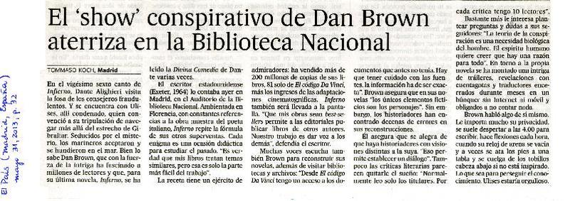 El "show" conspirativo de Dan Brown aterriza en la Biblioteca Nacional [artículo] Tommaso Koch.