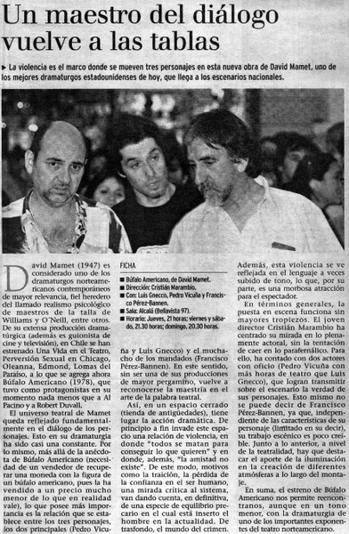 Estrenan versión local de Búfalo americano, de David Mamet. [artículo] Eduardo Guerrero del Río.