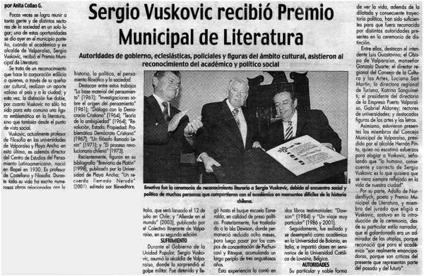 Sergio Vuskovic recibió Premio Municipal de Literatura [artículo] Anita Collao G.