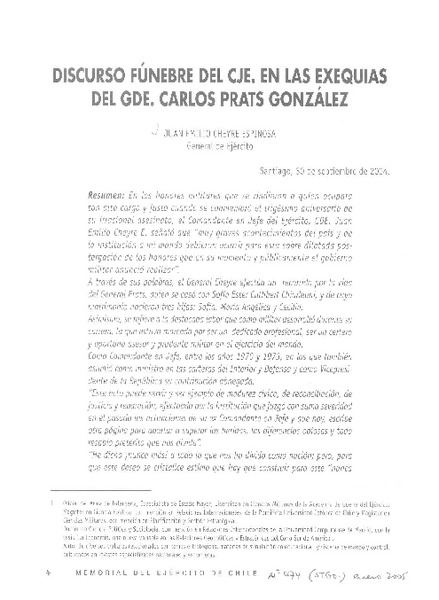 Discurso fúnebre del Cje. en las exequias del Gde. Carlos Prats González [artículo] Juan Emilio Cheyre Espinosa.