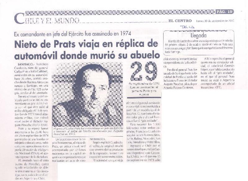 Nieto de Prats viaja en réplica de automóvil donde murió su abuelo [artículo].