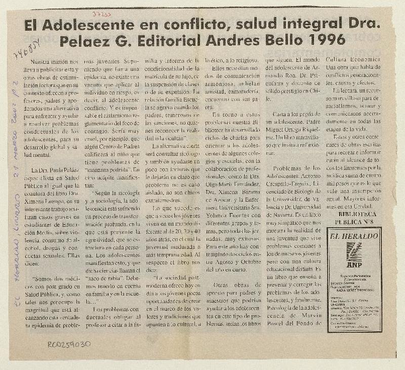 El adolescente en conflicto, salud integral Dra. Pelaez G. [artículo]