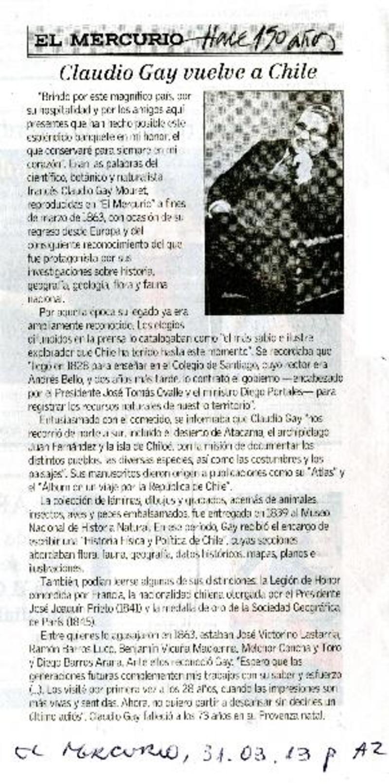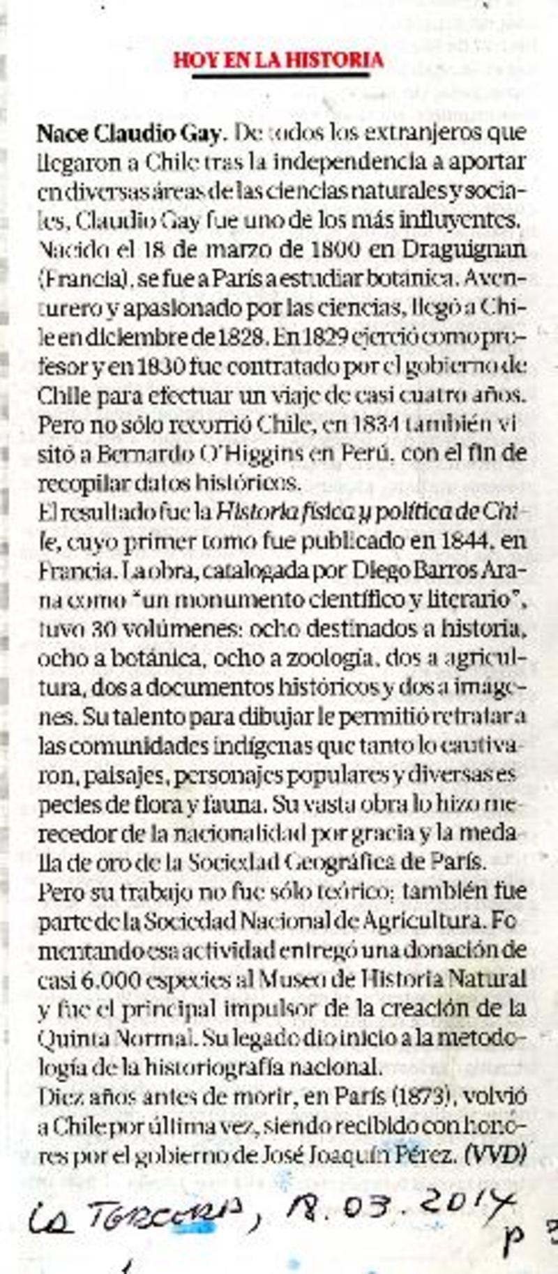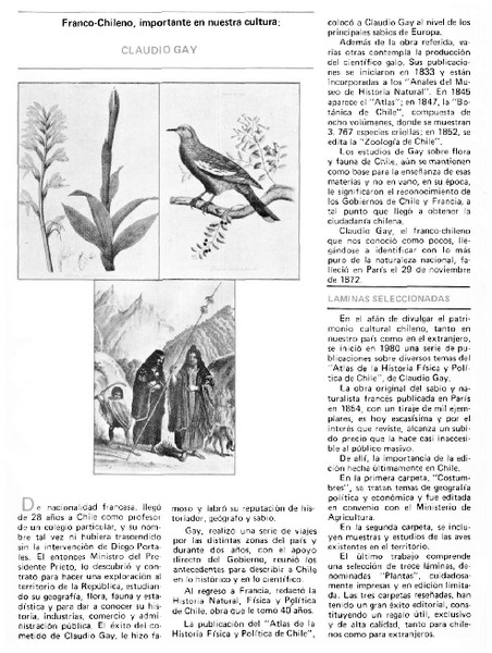 Franco-chileno, importante en nuestra cultura: Claudio Gay. [artículo]