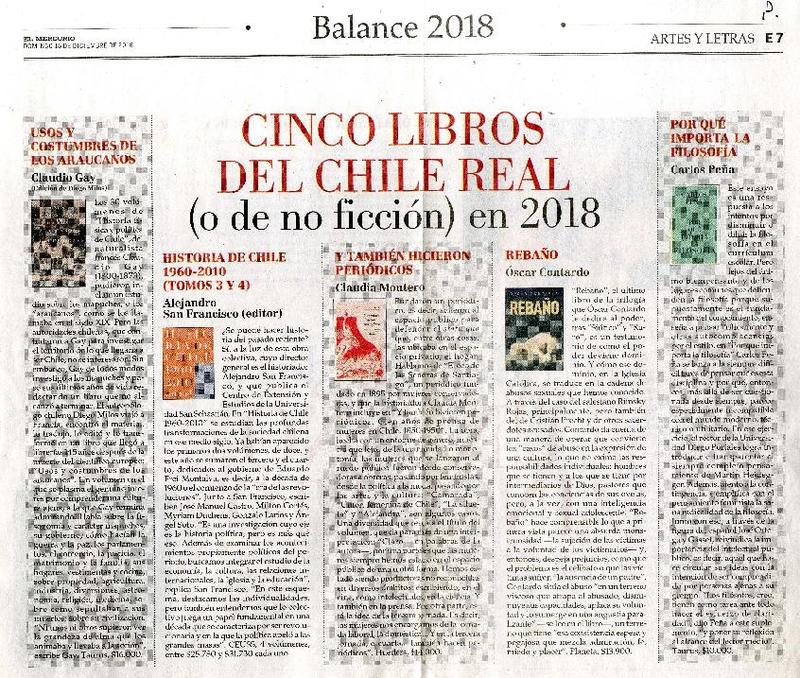 Autores chilenos - San Francisco, Alejandro - Gay, Claudio - Contardo, Óscar - Peña González, Carlos - Usos y constumbres de los Araucanos - Historia de Chile 1960-2010 (Tomos 3 y 4) - Montero, Claudia - Y también hicieron periódicos - Rebaño - Porqué importa la filosofía