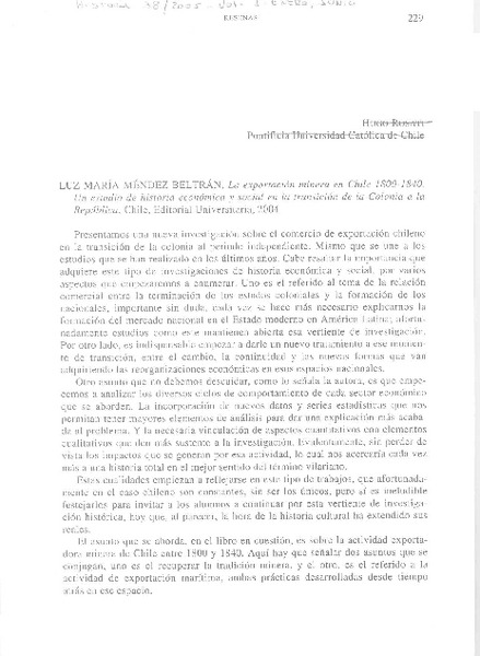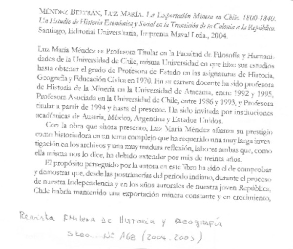 Autores chilenos - Méndez Beltrán, Luz María - Exportación minera en Chile 1800-1840